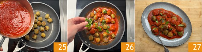 Add the sauce 25 and let the meatballs absorb the flavor for a few minutes. Finish with some basil 26 and serve. Your artichoke meatballs in sauce are ready to be enjoyed 27!