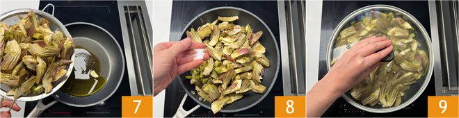 In a pan, pour the oil, add the garlic, and sauté for a few minutes. Add the well-drained artichokes 7 and season with salt 8. Stir, cover with a lid 9, and cook over medium heat for 15 minutes, stirring occasionally.