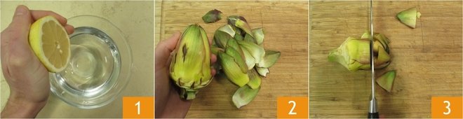 To make the artichoke risotto with crispy bacon, first prepare a bowl with water acidulated with lemon drops 1. Clean the artichokes: remove the outer leaves 2 and cut off the tougher tip of the inner ones 3. Use a paring knife or vegetable peeler to remove the outer and stringy part of the stem.
