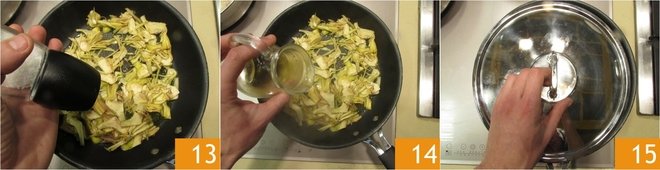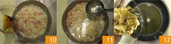 Deglaze with the bitter 10 and let the alcohol evaporate. Now continue cooking by gradually adding hot broth until the rice is cooked, which will take 18-20 minutes. Meanwhile, in another pan, heat a drizzle of oil and add the well-drained artichokes 12.