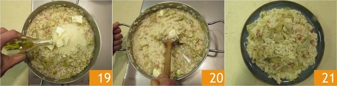 Add the artichokes to the risotto 16, which will have finished cooking, turn off the heat, and cream with grated cheese 17, butter 18