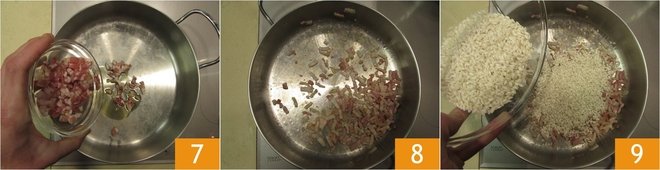 In a pan, heat a drizzle of oil 7 and sauté the bacon 8. Add the rice 9 and toast it for a couple of minutes.