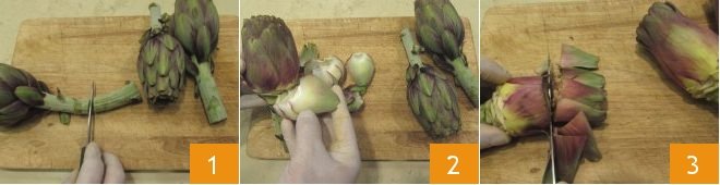 To prepare the artichoke salad, start with How to clean artichokes: first prepare acidulated water to keep the artichokes from turning brown as you clean them: fill a bowl with water and squeeze the juice of 1 lemon into it. Remove part of the artichoke stem 1 leaving a couple of inches. Peel the vegetables to remove the tougher outer leaves 2, with a knife cut off the tip 3