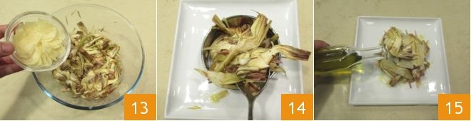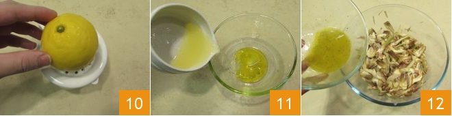 Squeeze 2 tablespoons of lemon juice 10 and add it to 1/4 cup of olive oil 11, salt, pepper and mix the emulsion with a whisk. Pour the artichokes into a bowl and season them with the citronette 12,