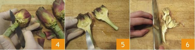 and the outer part of the stem 4 to keep the tender interior. Now that you have reached the heart of the artichoke, divide it into two equal parts, using a paring knife remove the central internal fuzz called the choke 5, thinly slice the artichokes 6