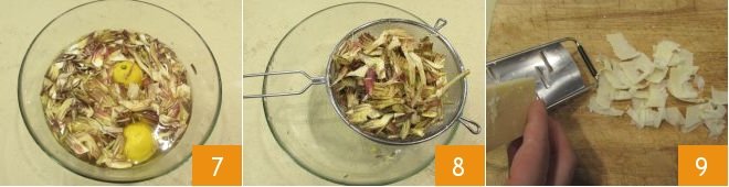 and place them in the bowl with acidulated water as you cut them 7. Once you have finished cleaning, drain them in a colander 8. Meanwhile, prepare the dressing: grate the Grana Padano into flakes 9 and set it aside.