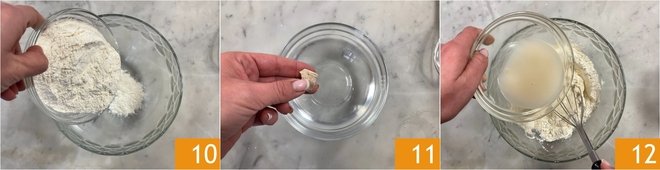 Now prepare the batter for the zeppole. Pour the flour into a bowl 10. In another bowl, dissolve the yeast in warm water 11 and pour everything into the flour 12.
