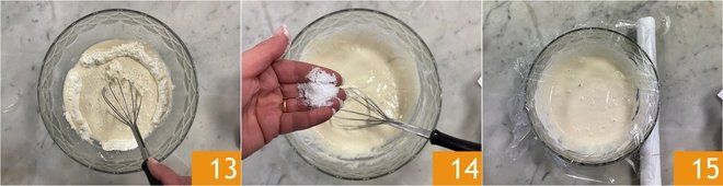 Mix with a whisk 13 until you obtain a smooth batter. Finally, add the salt 14 and cover with cling film 15.