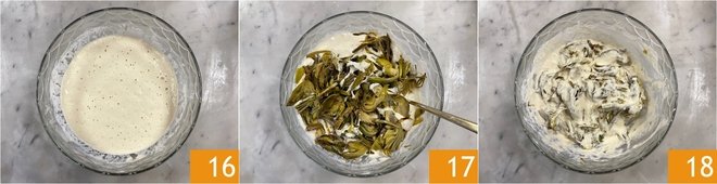 Let it rise for an hour 16. After this time, add the artichokes 17 and mix very gently 18.