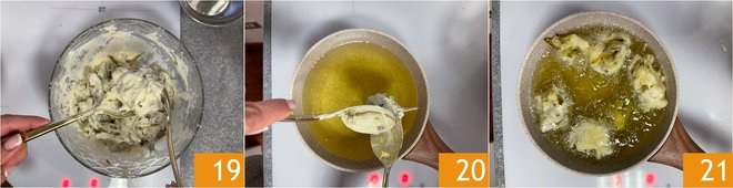 Heat plenty of seed oil in a high-sided pot, as soon as it's hot, using two spoons, take an amount of batter the size of a walnut 19 and let it slide into the oil 20. Immerse a few pieces at a time to avoid lowering the oil's temperature too much 21.