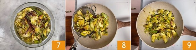 As you go, place the artichokes in acidulated water to prevent them from blackening 7. Drizzle a little oil in a pan and transfer the well-drained artichokes inside 8. Sauté on high heat for 5 minutes, then season with salt, lower the heat and cook for another 5 minutes 9. Allow them to cool completely, then cover the artichokes and set them aside.