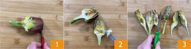 To prepare artichokes and potatoes, first clean the artichokes: remove the tougher outer leaves and cut off the tips 1. Peel the stem to make it more tender. Cut them in half and remove the inner choke 2, then cut them into wedges 3.