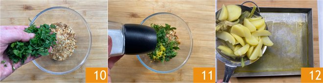 Mix breadcrumbs, mint, parsley 10, lemon zest, salt 11, and pepper in a bowl. Pour artichokes and potatoes into a baking dish greased with a little oil and distribute them evenly 12.