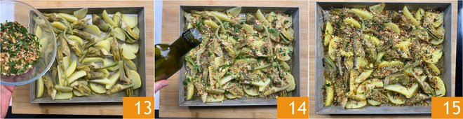 Cover with the breadcrumb mixture 13 and drizzle with some oil 14. Bake in a static oven at 350°F for about 25 minutes. If desired, give it a few minutes under the grill to brown it to your liking. Artichokes and potatoes are ready to be enjoyed 15.
