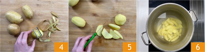 Peel the potatoes 4, wash them, and cut them in half and then each half into 4 wedges 5. Place them in a pot with cold water and bring to a boil 6.