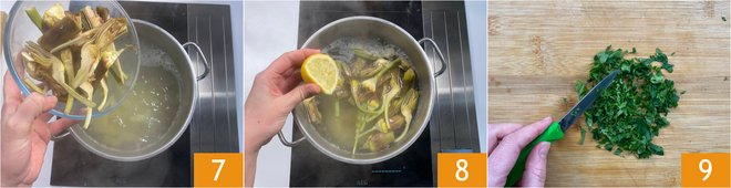 When the water comes to a boil, add the artichokes 7 and acidulate with a splash of lemon 8. Blanch them along with the potatoes for 5 minutes, then drain everything. Wash and chop the parsley and mint 9.