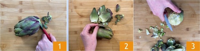 Clean the artichokes: cut off the stem completely 1, remove the outer and tough leaves 2 and with a paring knife round off the base of the artichoke 3.