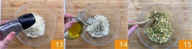 Add salt, pepper 13, and oil 14. Mix until you get a sandy and moist mixture 15.
