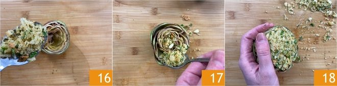 Take the artichokes and gently tap them on a cloth to remove excess water and dry them. Stuff them with the breadcrumb mixture, being generous in the center 16 and then proceed by spreading the outer petals and stuffing them as well 17. Finally, press the mixture well with your hands to return the artichoke to its rounded shape 18.