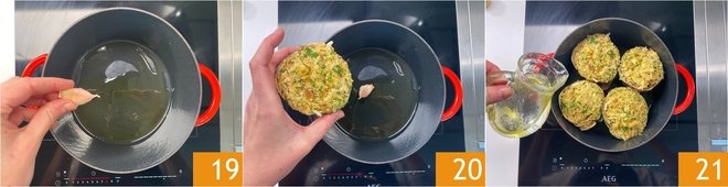 Pour a swirl of oil and a clove of garlic into a thick-bottomed pan 19. Let it flavor for a couple of minutes, then place the artichokes inside 20, which should be close, upright, and tight. Pour some water into the pan (you can rinse the jug where you weighed the oil) 21.