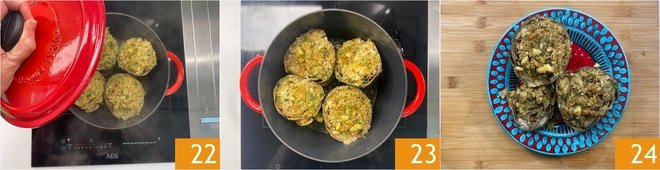 Cover with the lid 22, lower the heat and cook gently for about half an hour. During cooking, ensure the artichokes remain moist, adding a splash of water if necessary. Remove the lid, let any cooking liquid evaporate 23, and then serve the artichokes ammuddicati hot, with a grind of pepper and a drizzle of extra oil to taste 24.