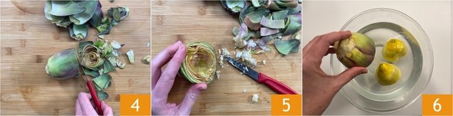 Then cut the tip 4 and spread open the artichoke like a flower to easily remove the internal choke 5. Place the cleaned artichoke upside down in a bowl of acidulated water with the juice of a lemon 6 and repeat the same operation for the others.