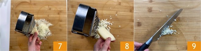 Prepare the breadcrumb mixture: grate the pecorino with the fine side of the grater 7 and the caciocavallo with the coarser side 8. Finely chop a clove of garlic 9 and the parsley.