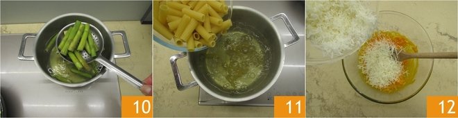 Remove the asparagus stalks 10, salt to taste and toss in the tortiglioni 11. Cook the pasta and in the meantime, in a bowl, combine the yolks, a ladleful of cooking water, and grated Pecorino 12. Mix well and set aside.