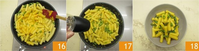 Drain the tortiglioni al dente 13 and transfer them directly to the pan with the asparagus 14, mix. Then remove the pan from the heat, add the yolk and Pecorino cream 15.