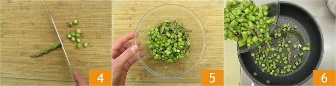 Meanwhile, slice the asparagus stalks into rounds about 0.4 inches thick, keeping the tips intact 4 5. In a pan, pour a drizzle of oil, heat slightly, and add the sliced asparagus 6.