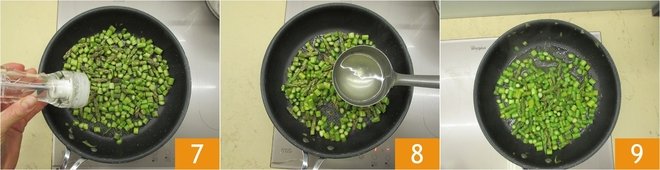 Season with salt 7 and pepper, stir occasionally, and let them season. Add a ladleful of cooking water (from the stalks) 8 and cook over moderate heat for about 5 minutes 9.