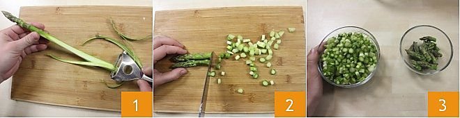 To prepare the asparagus flan, start by cleaning the asparagus (for more details, see the Cooking School: how to clean asparagus, which you can find How to clean asparagus) 1: peel the stem with a potato peeler or gently with a small knife, working vertically from top to bottom, until the stem turns white, removing the green filamentous part. Slice the stalk into rounds 2 and set the tips aside 3.