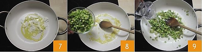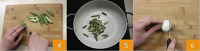 Once the scallions are sliced, place them in a non-stick pan with a drizzle of oil and sauté them until golden 7. Then, add the sliced asparagus 8 and cook, adding a bit of water or broth occasionally to prevent sticking 9. Season with salt and pepper to taste and cook over medium heat until no liquids remain.