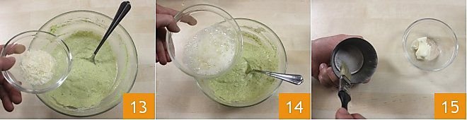 Also add the grated pecorino cheese 13 and lightly whipped egg whites 14 to the mixture. Mix everything together and set aside. Then take 5 steel molds with a capacity of 6 oz and butter them evenly with a brush to uniformly coat the sides of the molds 15. You can also use aluminum molds found at the supermarket.
