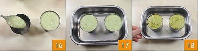 Pour the obtained mixture into the molds 16 and place them in a small aluminum baking dish, filling it with water halfway up 17. At this point, bake in a preheated static oven at 356°F for 45 minutes (if using a convection oven, bake at 320°F for 35 minutes) until the surface becomes slightly golden 18.