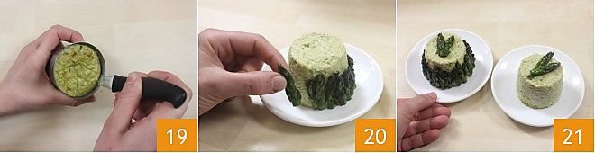 Let the asparagus flan cool slightly and carefully unmold it by detaching it from the edge with a small knife 19; to assist, you can dip the mold in boiling water to help the edges detach better from the mold. Decorate the asparagus flan with the tips you sautéed and set aside, unleashing your creativity (20-21). Your asparagus flan is ready to be served and enjoyed!