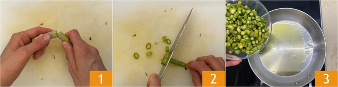 To prepare the asparagus lasagna, first focus on How to clean asparagus: remove the woodiest part 1 and cut the stalks into diamond shapes 2, leaving the tips intact. In a pan, heat a drizzle of olive oil, then add the asparagus stalks 3.