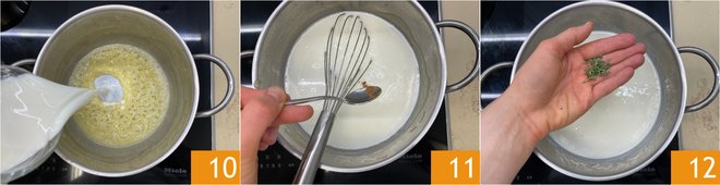 At this point, pour in the hot milk 10, flavor with nutmeg 11 and thyme 12, and continue to cook over low heat until the desired consistency is achieved. It will take 5-6 minutes to reach a medium density.