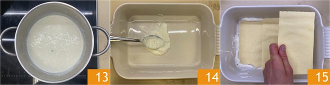 Once the béchamel sauce is ready 13, spread a few spoonfuls on the bottom of a 10x7 inch baking dish 14, then lay the pasta sheets 15.
