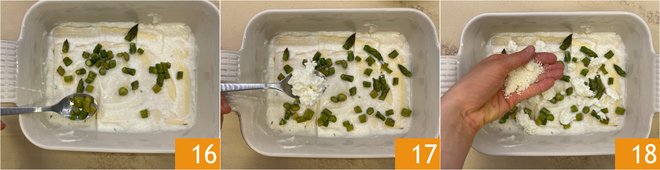 Cover the sheets with the béchamel sauce, then add the asparagus 16, shredded mozzarella 17, and grated Parmigiano Reggiano cheese 18.