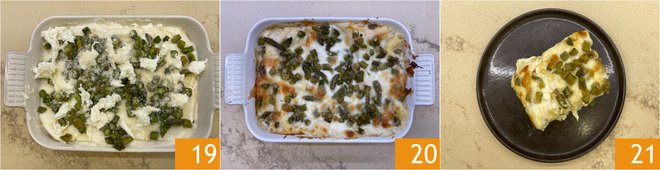 Continue forming layers in this way until all ingredients are used up 19. Bake in a static oven at 350°F for 20 minutes, then turn on the grill at 400°F and continue cooking for 5 minutes 20. Your asparagus lasagna is ready to be enjoyed 21!