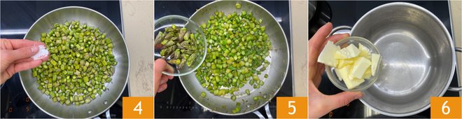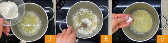 Add the flour 7 and stir vigorously to prevent lumps from forming 8. Season with salt 9 and continue stirring until a golden mixture forms, the roux.