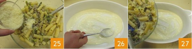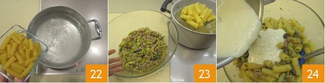 Boil the rigatoni 22, being careful to leave them al dente. Once ready, drain them with a slotted spoon directly into the bowl where you set aside the asparagus and sausage sauce 23, add a third of the béchamel sauce 24