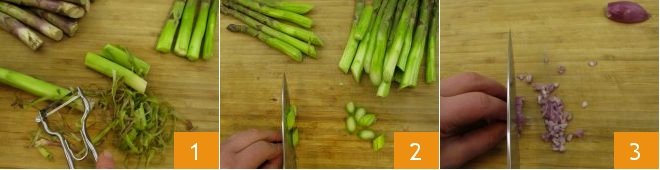 To prepare the asparagus pie, start by preparing the Vegetable broth. Then clean the asparagus with a peeler to remove the fibrous part of the stem 1. Cut off the white part at the base and slice the asparagus into rounds 2, being careful to keep the asparagus tips whole. Clean and finely chop the shallot 3.