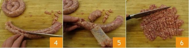 With a knife, cut the casing of the sausage lengthwise 4 to remove it easily 5 and finely chop the meat 6.