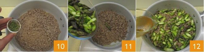 season with chopped rosemary 10 and add the sliced asparagus with the tips left whole 11; cover with vegetable broth 12, continue cooking the ragù over moderate heat for 20 minutes, stirring occasionally with a wooden spoon.
