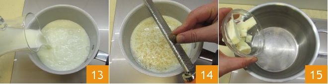 Meanwhile, prepare the béchamel sauce: pour the milk into a saucepan 13 and heat it, letting it just come to a boil, then flavor it with grated nutmeg 14. In another pot, melt the butter over low heat 15,