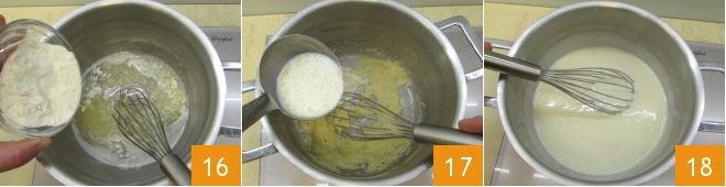then turn off the heat and add the sifted flour little by little 16, stirring with a whisk to prevent lumps. Then put it back on low heat and stir until it becomes golden. At this point, gradually add the hot milk 17, stirring vigorously with the whisk. Cook for 5-6 minutes over low heat until the sauce thickens, continuing to stir 18; finally, salt and pepper to taste and turn off the heat.