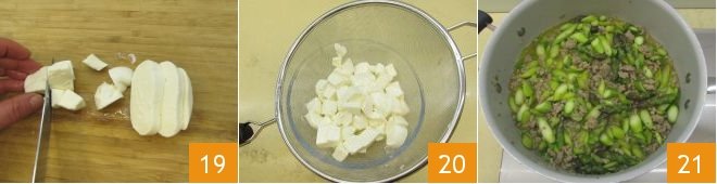 Place a pot with plenty of water on the stove to salt when it boils. Meanwhile, cut the mozzarella into cubes 19, let it drain well by placing it in a colander with a bowl underneath to collect the whey 20. Meanwhile, the asparagus and sausage sauce will be cooked 21; pour it into a bowl and set aside.