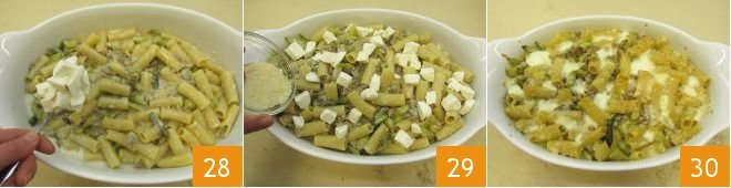 and 70 g (2.5 oz) of grated Grana Padano 25 and mix. Take a rather large baking dish that can hold the pasta, pour a layer of béchamel sauce on the bottom 26, then add half of the pasta 27,